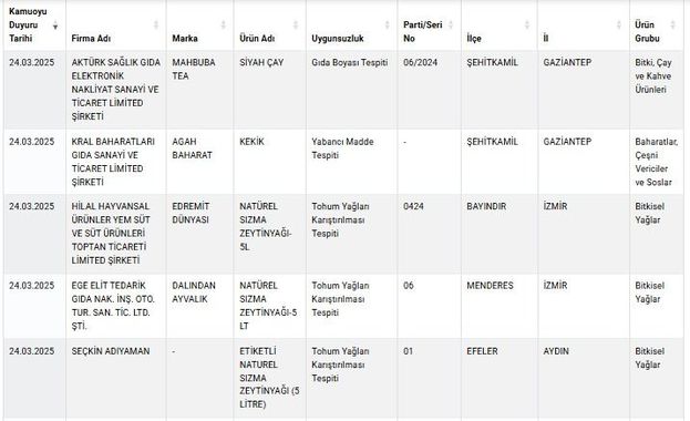 Listeye göre, denetlemeler sonucunda Adana’nın Yüreğir ilçesinde faaliyet gösteren bir kasabın kırmızı etlerinde tek tırnaklı eti tespit edildi. Bunun yanı sıra zeytinyağı üretimi yapan 3 firmanın ürünlerine tohum yağlarının karıştırıldığı belirlendi. Gaziantep’in Şehitkamil ilçesinde üretim yapan bir firmanın siyah çaya gıda boyası karıştırdığı ortaya çıktı.